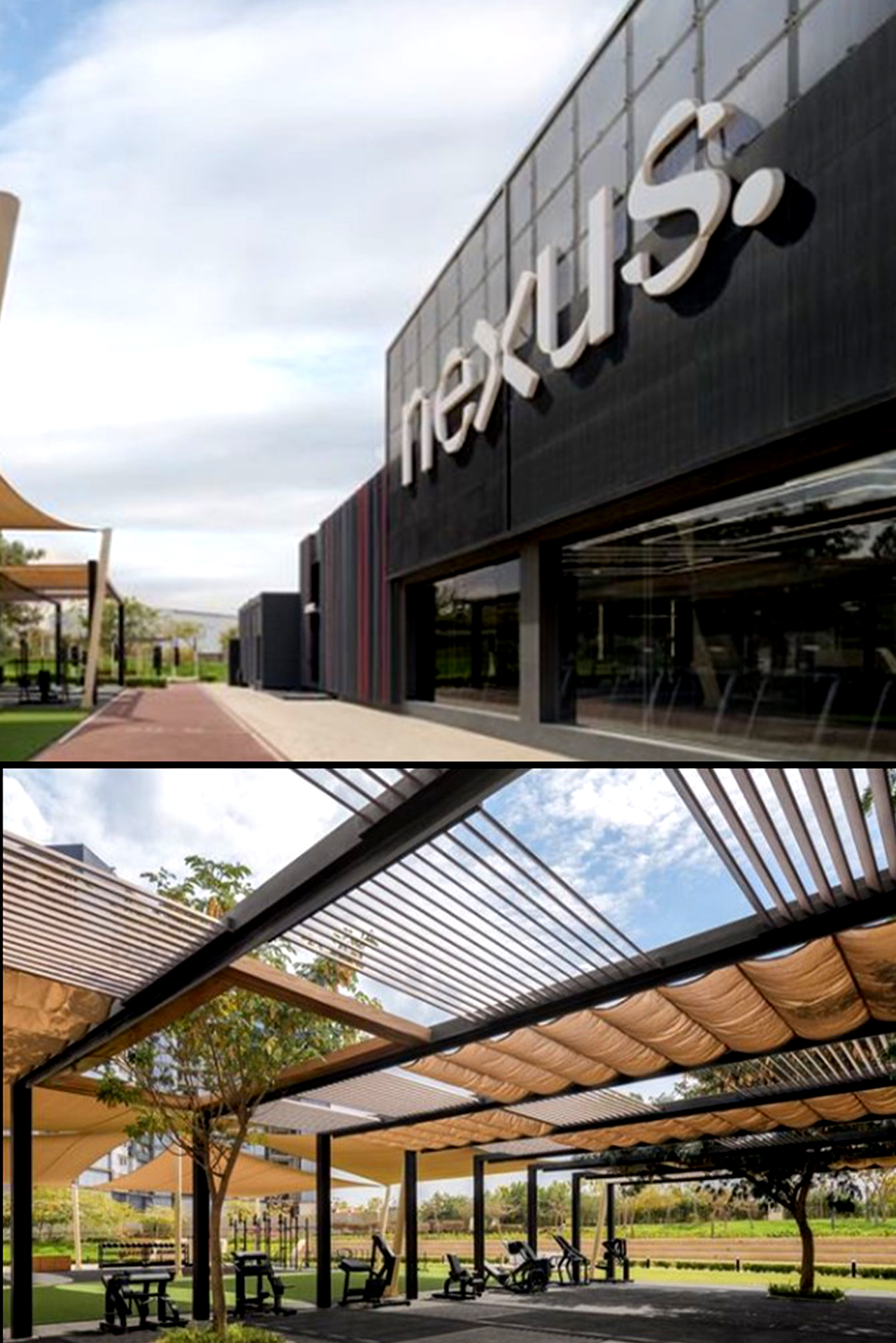 A modern fitness space at Zed Park, designed for workouts, including a huge workout area, studio, offices, and retail services.